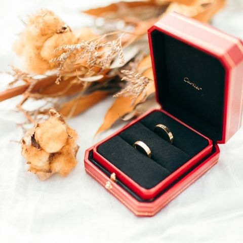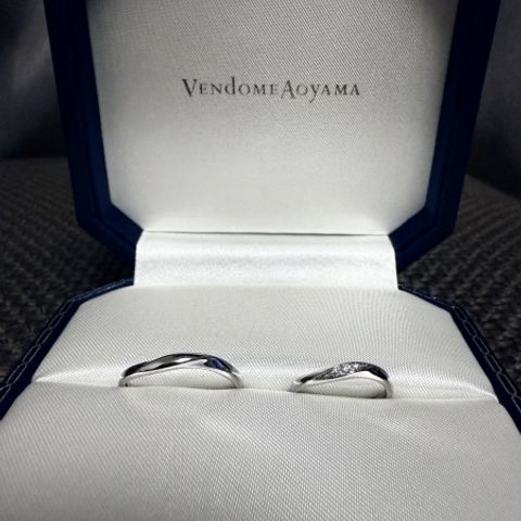 シンプルかつ飽きのこないデザインです。夫の指輪はダイヤなし、わたしは2つ小さなダイヤが埋め込まれているものにしました。真ん中が少しくぼみがあるデザインが指を長くして見せてくれます。夢だった赤いボックスも最高に素敵です!