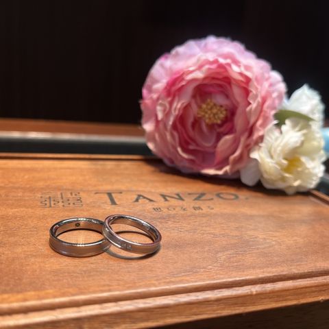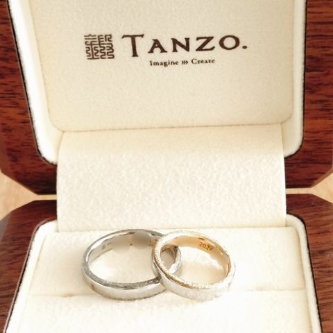 2人の指輪を「槌目加工」と「斜め削り」でお揃いにした上で、女性側を映える色合い、男性側をアイスマットにしたことで、ベースは同じでもお互いに個性のある指輪を作ることができた。槌目加工による光の反射が想像以上に綺麗で、気に入っている。