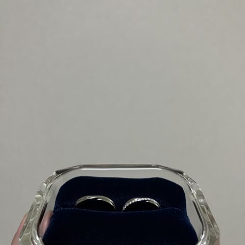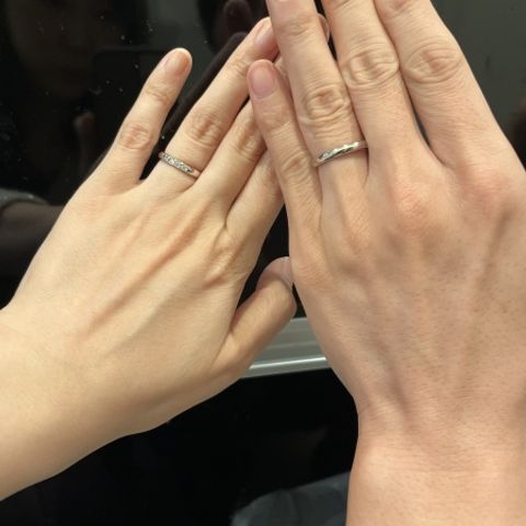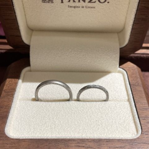 シンプルだけど少しデザインが入っているような指輪を探しており、希望通りストレートの指輪に斜めのライン2本が入ったデザインに仕上げていただきました。ライン2本の傾きがそれぞれ異なり、相手の指輪と重ねるとラインが重なるようになっており、ずれもなく大変綺麗に仕上げていただきました。 また、ラインの中はそれぞれ異なる種類のマット仕上げになっており、お互いの好きなデザインを入れることができました。
