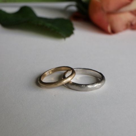 セミオーダーでミル打ちをしてもらい、幅と厚みも好みのかたちにしました。 両面ともプラチナにしましたが、石なども入れなかった為シンプル過ぎてしまい、内側はゴールドにすればよかったな?と思いました。 色違いのサンプルがお店に無く写真だけでの判断だったので、イメージと違うものになりましたが、毎日身につけるので手に馴染んでいくと思います。
