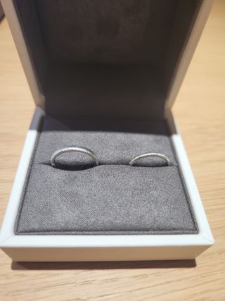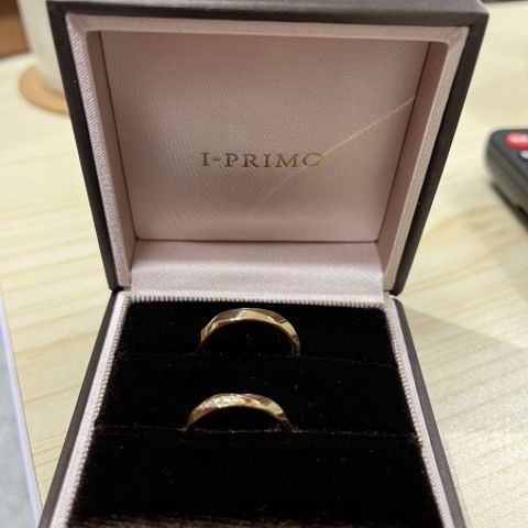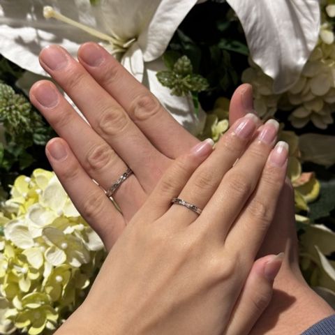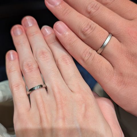 それぞれ違うデザインだが、うち目とデザインの切り替わるところがお揃いでシンプルながら綺麗な指輪になった。 内側にお互いの名前・誕生石を入れることが出来たため、表面だけでなくしっかり見ると2人だけの指輪ということがしっかりとわかって嬉しい。