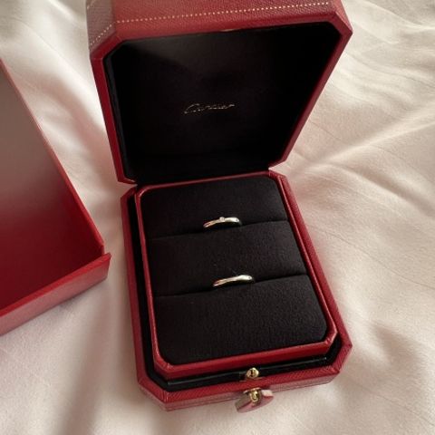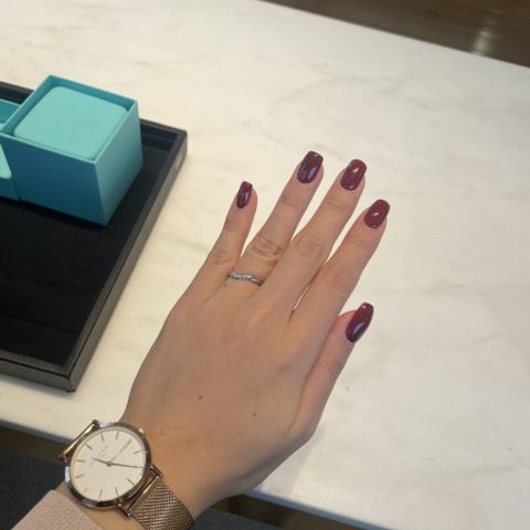 シンプルなデザインであり、結婚指輪が他のブランドでも重ねづけしやすいという点が良いです。リングの幅もスリムなので、女性など指が細めの方に向いていると思います。着け心地がちょうど良く、違和感がないです。