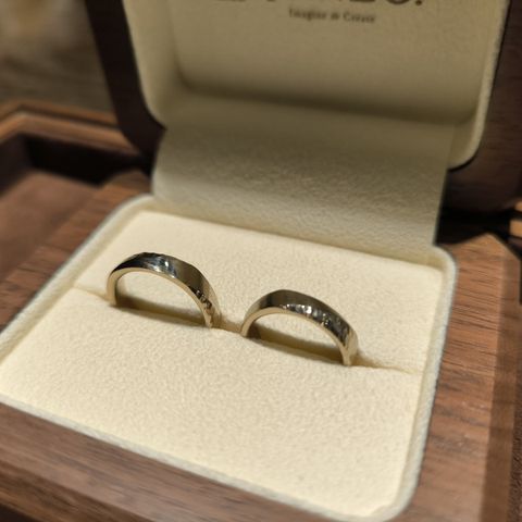 店舗に伺う前より「なんとなく槌目ってかっこいいよね」と話しており、槌目加工を入れていただきました。色は、ゴールドが好きでしたが、シルバーの方が服や他のアクセサリーと合わせやすいイメージがあり、間をとってシャンパンゴールドにを選びました。また、一本の地金からペアの指輪を作っていただく製法で作っていただきました。