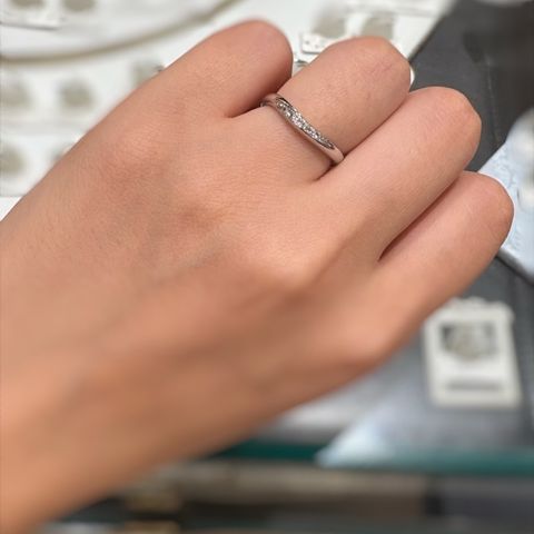 シンプルで洗練されたデザインです。 ダイヤが平面的ではなく、立体的に配置されているので、着用している時に自分側からもダイヤが見えます。 曲線的で、日本人の指に似合うデザインです。 リングが細いので、華奢に見せてくれます。