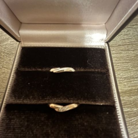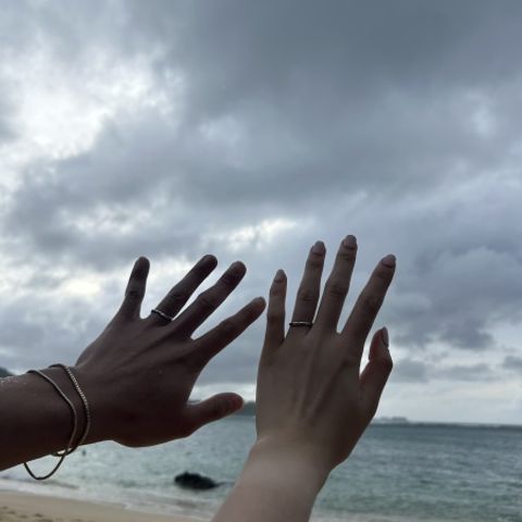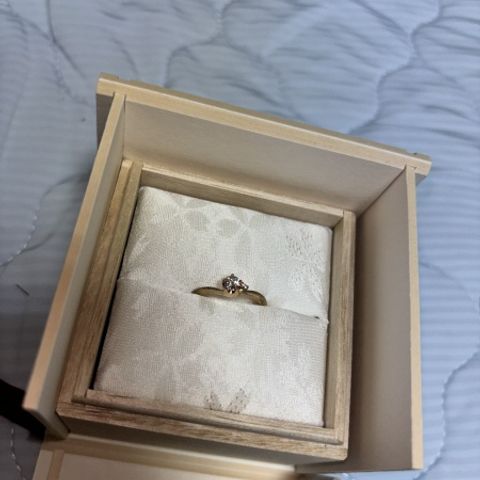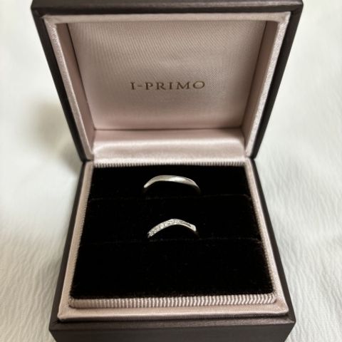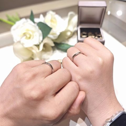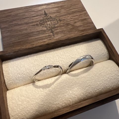 私たちの好みを細かく聞いてくださり、いいとこ取りの指輪をデザインしていただきました。ウェーブの形や1つの石から2つ取れるダイヤをつけるなどお揃いのデザインがとても気に入っています。2人とも指輪を外すことも多いということで、2つ重ねて置いた時にハートができるデザインにしていただけたのも嬉しいです。