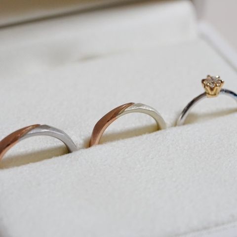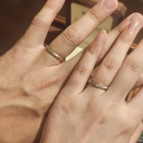 2人とも指が太くて短いのが悩みなので、真っ直ぐのリングではなく緩やかにカーブしたS字リングをベースにして、新婦はピンクゴールドにスターダスト加工、新郎はホワイトゴールドに槌目加工と、少し色味や加工を変えました。 始めは色を揃えようと思っていましたが、ずっと着けているものなので各々が似合う色を選べたのがよかったです。