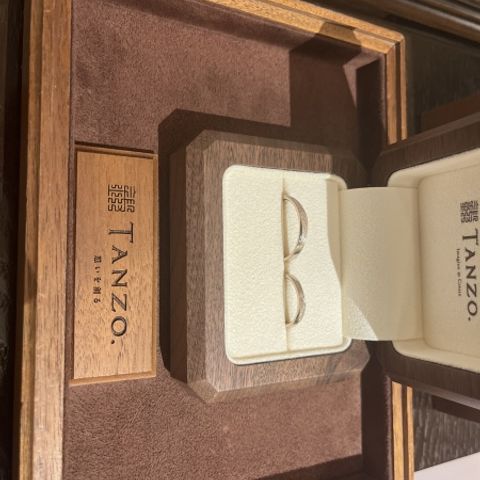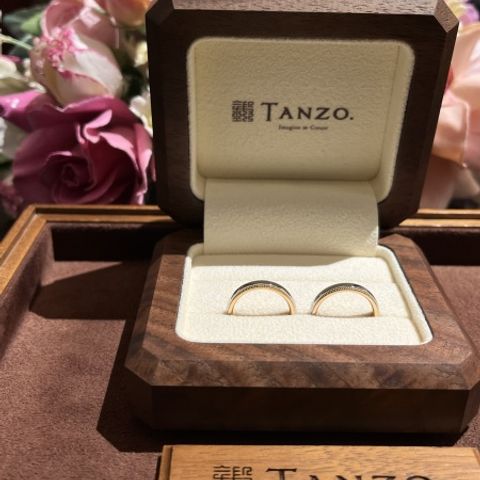 指輪はすべてTANZOオリジナルのカラー「コーラルゴールド」でお願いしました。ピンクゴールドよりも華美でなく、シャンパンゴールドよりも黄味が控えめで、男性も違和感なく着けられる色味だと思いました。 相談の際、婚約指輪は手作りの鍛造製法になると聞いていたので、少し無骨な仕上がりになるのかと思っていましたが、繊細かつ華奢に作っていただき、想像以上の仕上がりに感動しました。 結婚指輪は、シンプルなS字形状ながら、1エッジ加工で梨地と鏡面のコントラストを強調する美しい指輪に仕立てていただきました。夫も、思い描いた通りの指輪になったと、満足そうでした。