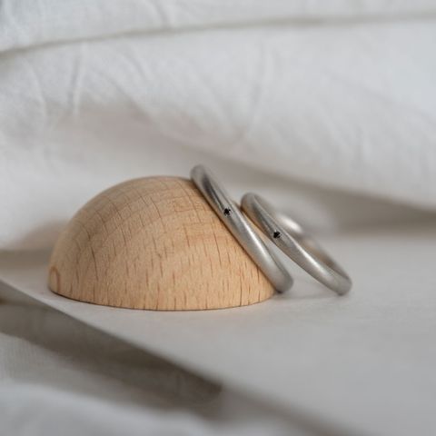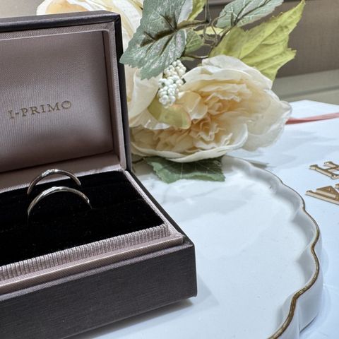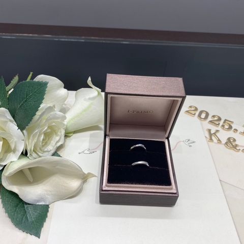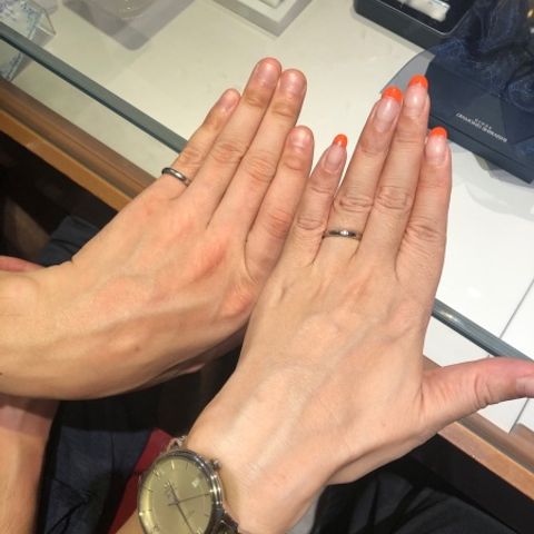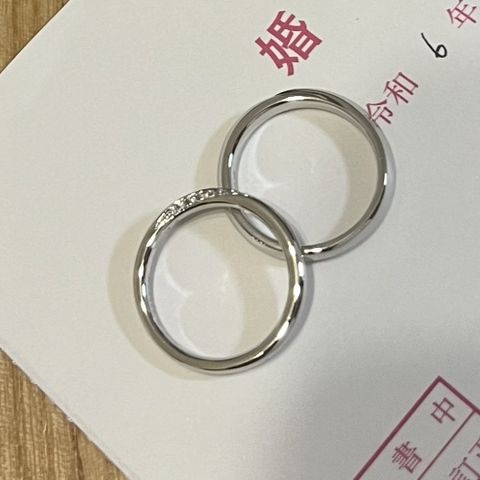 シンプルなデザインかつ自分達らしく、お互いに似合うものを探していたので半分カット加工してあるこのデザインは、仕事でつけていても主張しすぎず、けれど角度によってはキラキラっと輝いてくれるところが良かったです!