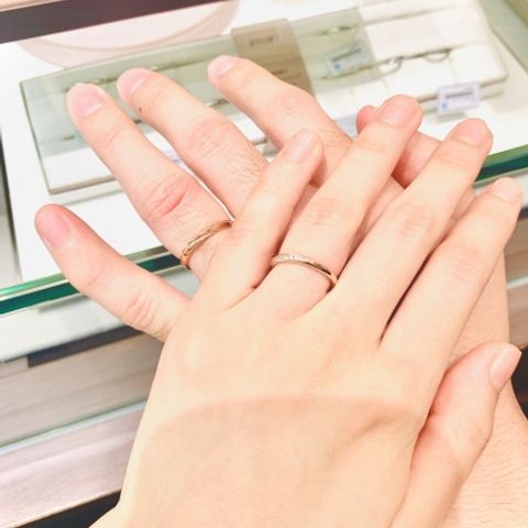 ウェーブ型で指の付け根の形に沿うので、肌あたりが気になりにくいです。男性用は一部マット加工されていて、普段アクセサリーをつけない彼も使いやすいと思います。女性用はダイヤ7つが施されていて、どの角度からも輝いて見えるようなとめ方をされているそうです。