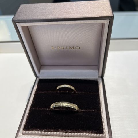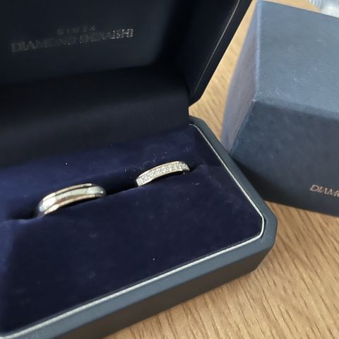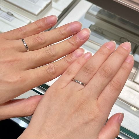女性用はハーフエタニティ、男性用はシンプルなデザインを探していました。何件も回った中で、ハーフエタニティのダイヤの輝きが特に綺麗だった印象です。指輪も細すぎず、婚約指輪と合わせた時にバランスがとれ手元が綺麗に見えます。