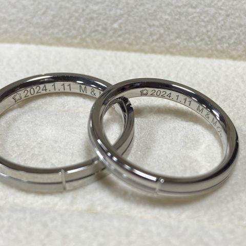 落ち着いたデザインで普段から違和感なくつけられます! シンプルよりですが、上下のミルをいれていただきました。 ペアリングのため、女性用は丸みを帯びた可愛らしいデザインに、男性用は平らなデザインにしました。