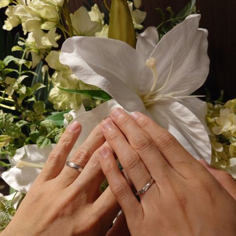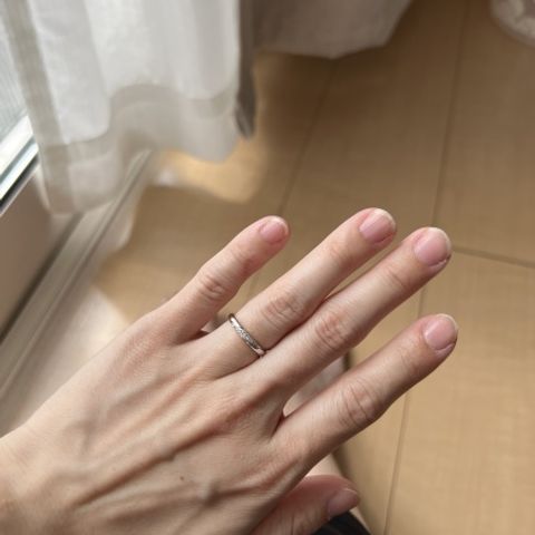 入籍日に合わせて、9つのダイヤをいれました。ゆっくりカーブを描いているのも気に入っています。付け心地もバッチリでつけていることを忘れてしまいそうなくらいピッタリです。理想通りに指輪ができるように助けてもらいました。