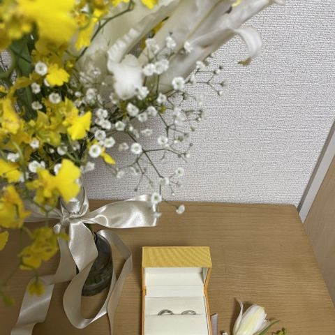 指輪のデザインに関しては実際のデザインの入った指輪の中からいくつか選び、2人に合いそうな物を抽出していきました。そこから各々の好きなテイスト、加工を加え、日付や名前を刻印していきました。入籍指輪もシンプルで安価な指輪を作っていただき、結婚指輪の参考になりました!