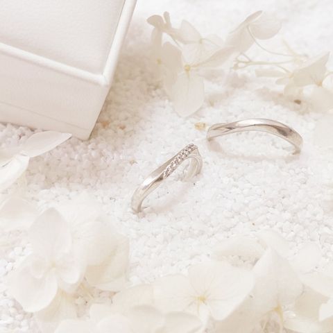 指輪のデザインは入籍日にちなんだダイヤの数で決めました。2人のそれぞれの指の特徴からS字のデザインにし、長くつけていられるよう着け心地の良さも考慮しました。指輪の込められた意味も素敵なペアリングです。