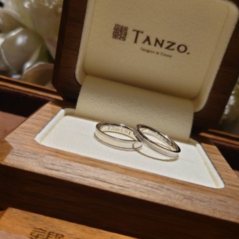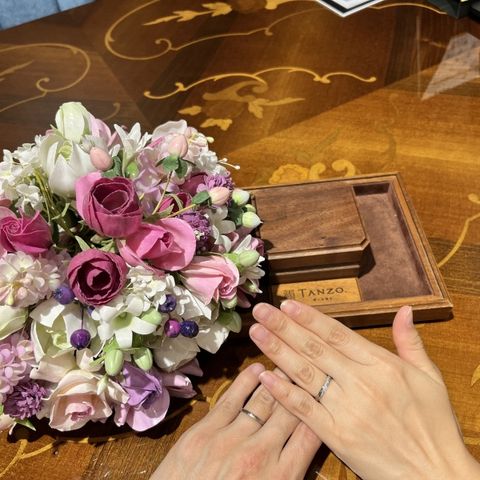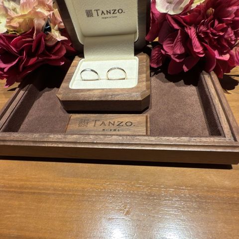 婚約指輪は、ハーフエタニティに。結婚指輪は婚約指輪が華やかなのでシンプルなデザインにしました。外資系のブランドも何店舗か見に行きましたが、TANZOの指輪はどこよりも付け心地がよかったです。素敵な指輪にできたのが本当に嬉しいです。
