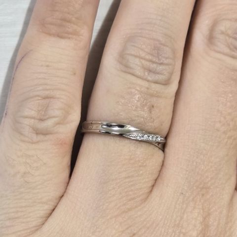 女性側の結婚指輪にはダイヤモンドが敷き詰められていて、可愛い でも華美すぎず、日常使いできる! ダイヤモンドが出っ張っておらず、毎日つけていても引っかからない。 男女ともにシンプルだけれど、ねじれのデザインが可愛い。
