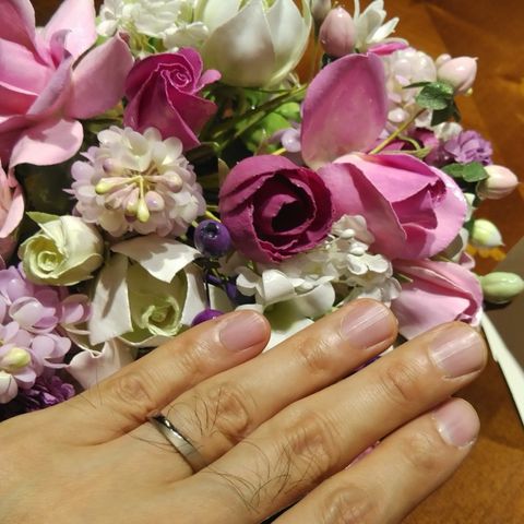 結婚指輪ですが、妻の希望するダイヤを散りばめて世界で一つだけの指輪を作りました!! おすすめポイントしては、仕事柄常につけることが難しい方というのはどうしてもいらっしゃるとは思いますが、仕事以外で着用するのに妥協しないでカッコイイデザイン になるよう考えました!