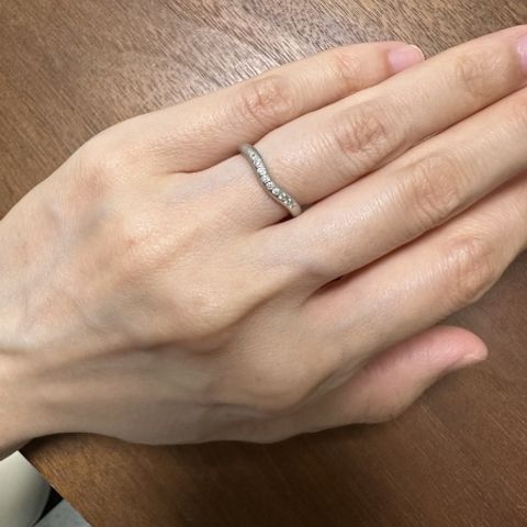 小さなダイヤモンドが流れるように配置された華奢な細身のリングで、細身の腕・指先に合うこと。ダイヤモンドの粒も細かく、日常利用に派手すぎず、下品な感覚を受けない。一方で、歳を重ねても可愛すぎるようにも見えず、長く使えるものと見えた。