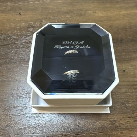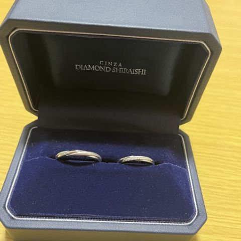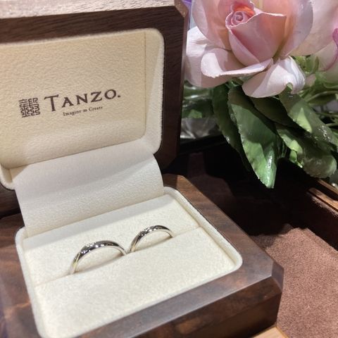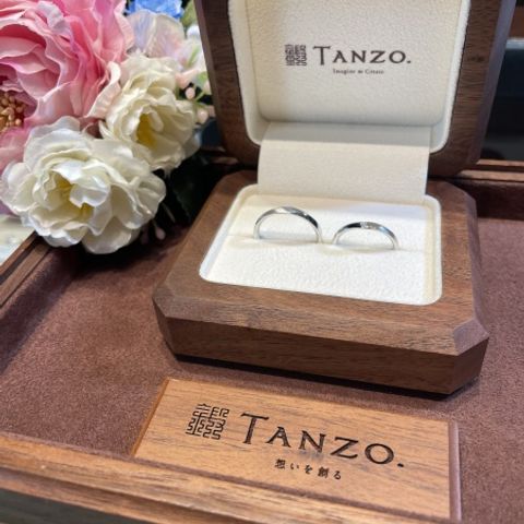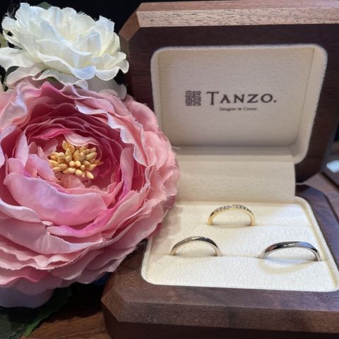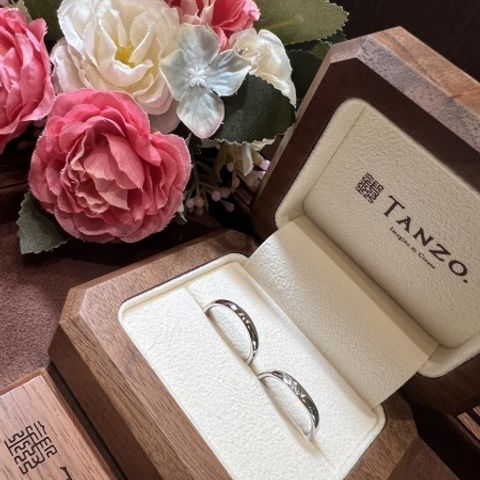 婚約指輪のダイヤの幅に合わせ夫は梨地というマット加工。私は、TANZOを知った時から憧れていたスターダストという加工にしました。ダイヤが入っていないのに、表面の細かい凸凹でキラキラ輝くスターダストの実物を手に取ることが出来て本当に嬉しかったです。細かい加工ができる技術に驚きました。 斜め加工の所を少し立体的にしたら思ってたより目立ってくれていたので大満足でした! 夫とお揃い感のあるデザインになって世界に一つだけの指輪に感動です。