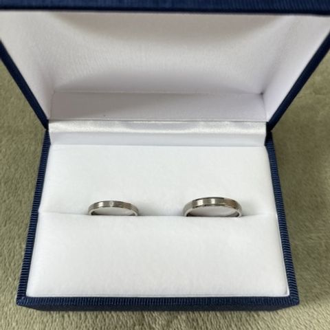 ptauのミストフラットのシンプルデザインを選びました。 女性2.5mmのダイヤ中央1個0.03ct 男性3.5mm石なし 貴金属100%のインゴットから作成するので硬度が高く、内甲丸加工で仕上げてるのでフィット感があります。