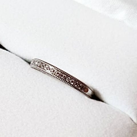ミル打ち×ダイヤモンドがクラシカルな印象で可愛いです。Pt999で丈夫というのが決め手でした。 光に当たると小さいダイヤモンドがキラキラと沢山煌めいてとても綺麗で、購入から数年経った今でも見惚れてしまいます。