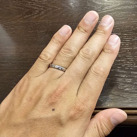 平打ちで太いので見栄えがよく、ふとした時に目に入ってとても幸せな気持ちになれる。 ワンポイントで入れていただいたスターダストは、相手のダイヤと同じ位置に入れてもらい、お揃いのようなデザインにしていただいた。 着け心地も良く、つけていて本当にいい指輪だなと感じる。