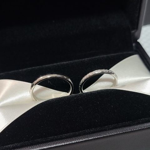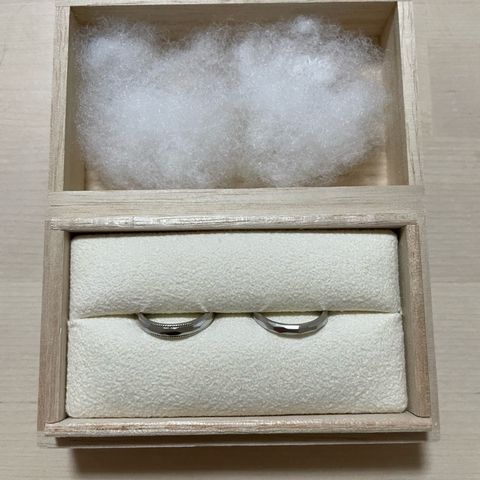 いつも着用するので丈夫なプラチナを選びました。デザインも大事でしたが、私はつけ心地が一番気になっていたので着用してつけ心地の良さに一目惚れしました。二人で種類は揃え、男性用はつや消し加工をオプションでしています。