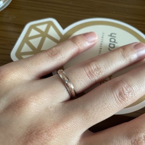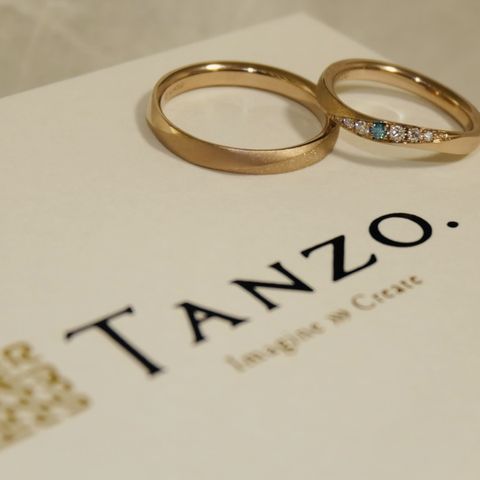 ダイヤを美しくあしらってもらいました。全く同じでないけれど、夫婦で同じデザインにしてもらい、離れていても相手を感じられるデザインで嬉しいです。指輪のデザインだけでなく、指輪のカラーもTANZO.さんオリジナルカラーのものもあり、豊富な色味から選べたのでイエベブルベどちらの方にも合う色味がありそうです!