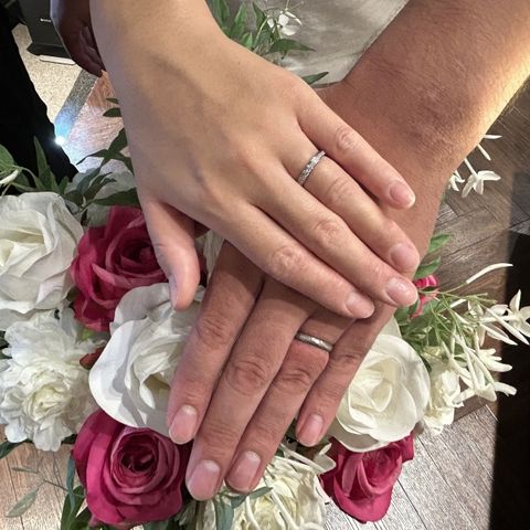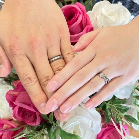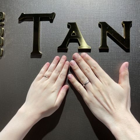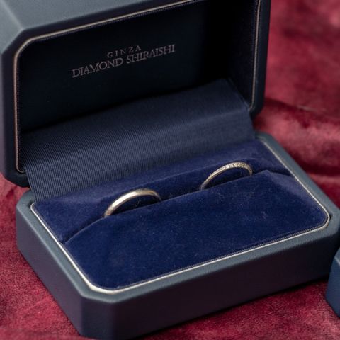 たくさんのお店を巡る中で、 ①2人で満足できる ②お揃い感がある ③着け心地が良い ④高齢になっても飽きが来なさそう を重要視したいとなり、 特に①②から、TANZO.さんにお願いすることにしました。 他ブランドも素敵なものが③④を満たすものは たくさんありましたが、 彼の「新婦が選ぶもののペアにするよ」の言葉に 私は納得できず、お互いに心から満足して購入したいと 思っていましたが、 男性物には特徴があまり無い物が多く、 納得できるものに巡り会えませんでした。 この背景からフルオーダーメイドを選択し、 彼のマット加工やライン・槌目の希望を折り込み、 私は指輪の太さや、ダイヤと無地部分の比率について 1mm単位でこだわり、 納得のいく指輪となりました。