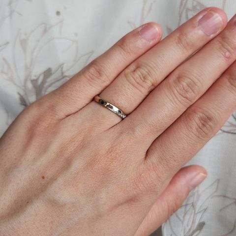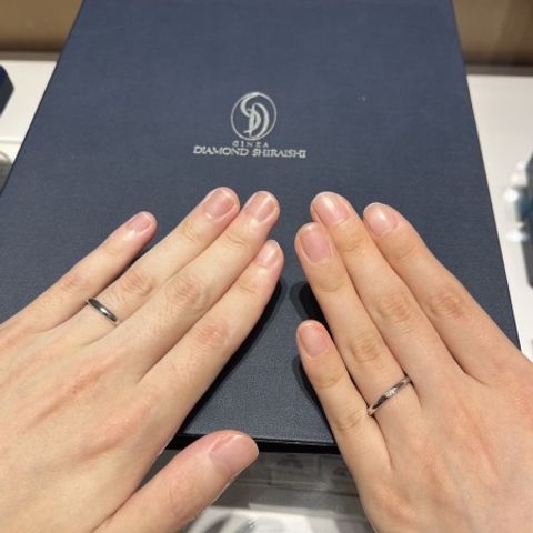 丈夫なプラチナの鍛造作り。デザインは細目で華奢で手が綺麗に見えます。重ねると2本のラインが繋がっていくデザインにも惹かれました。女性用リングには3粒のダイヤが埋め込まれており、キラキラと光っていて上品でかわいいです。