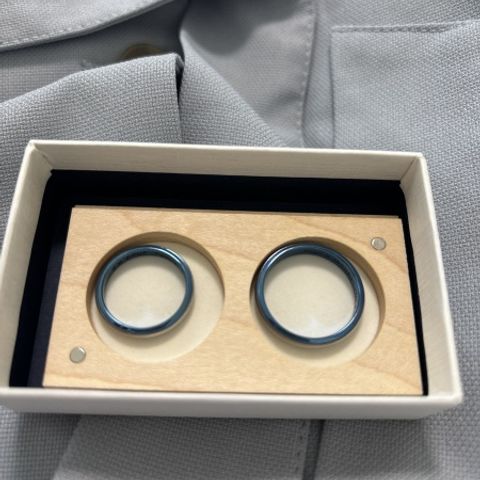 木目金の模様で手作り体験できる点に魅力を感じております。もともとものづくりが好きな夫婦なので、スタッフさんと楽しく作れて満足しています。サイズ調整が永久無料で付いている点も安心です。付け心地もよいです。