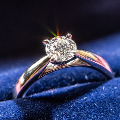 流行り廃りに左右されないシンプルなリングを選びました。 また、2人で指輪を見に行ったときに店員さんが石の蛍光性について見せてくださったのですが、ブラックライトに照らされた石が青く光るのに2人がとても感動し、それ以来購入するダイヤは絶対に強い蛍光性のある石にしようと決めていました。 最終的には蛍光性がある石を僕が探し、あとから奥さんがリングを選んで今の形になりました。