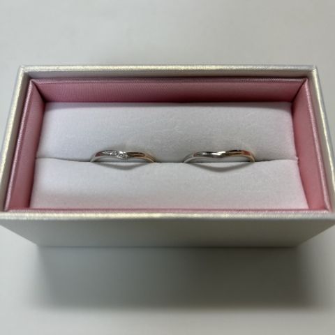 コーラルゴールドがとても素敵でした。S字に石が入っているデザインもお気に入りで、婚約指輪との重ね付けにもピッタリでした。夫のシルバーにシンプルな模様を入れたのもとても素敵で、かっこいい出来上がりになりました。大満足でした。一生大事にします。