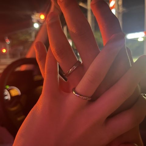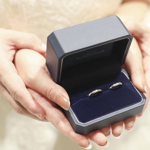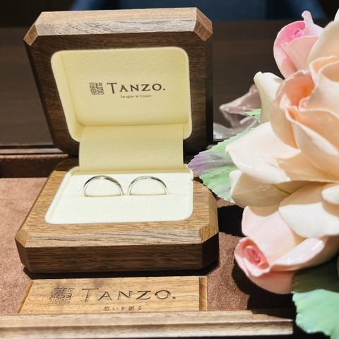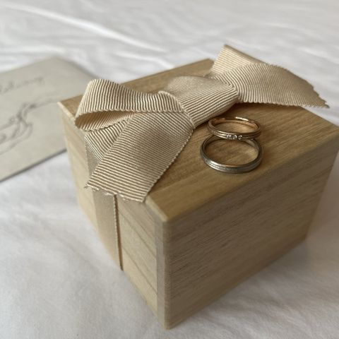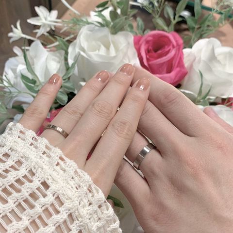 指輪の素材は別々にしたのですが(ピンクゴールドの色味が気に入ったが新郎はシルバーを希望していた為)形状や表面のテクスチャを合わせて統一感を出すことが出来ました。 内甲丸は着用のし易さだけかと思いましたが、 2人とも平打ちストレートにしたので指輪に自然な厚みがあり、どの角度から見てもペア感があり満足しています。