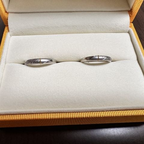 既製品をベースにセミオーダーの形で艶消しや模様の追加。 指輪の内側のデザイン入力をして頂きました! 純系結びの色もゴールドで可愛いくワンポイントになり、 艶消しがあったからこそ、2人のイニシャル(K,H)をもじった波模様がよりハッキリと世界で一つだけの結婚指輪になりました!