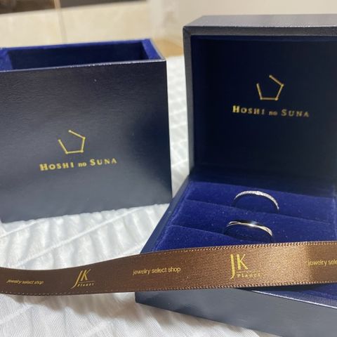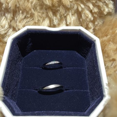 シンプルかつ、ずっと着けていられる飽きのこないデザイン。を1番に考え、それぞれが別々の種類の指輪を選び買いました。2人の要望にそったいい指輪に出会えたのでとても嬉しいです。 それぞれブルーダイヤを内側に入れ、嫁のはダイヤ6個とグリーンダイヤ一個を入れました。 自分はダイヤ入れるの恥ずかしいなと思ってましたが、ブルーダイヤのサムシングブルーの話を聞いて即決で入れました。花嫁に幸運をもたらす。いいじゃないですか。あれ男にはないのかい?とは思いましたが。