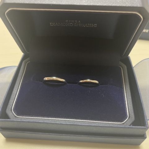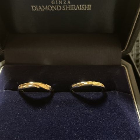 ストレートよりもカーブを選びました。シルバーが多い中ゴールドの選択をしました。女性側にダイヤモンドを入れることでより華やかな印象になりました。入籍日を裏側に入れ特別な指輪に仕上げていただきました。可愛いです。