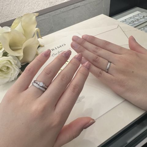 パーソナルハンド診断をしていただき、私がウェーブタイプ、彼がストレートタイプが似合うとのこと。なので、形はストレートだけど、デザインがウェーブのような指輪を選ばせていただきました。二人に似合う指輪を選ぶことができ、とても満足しております。