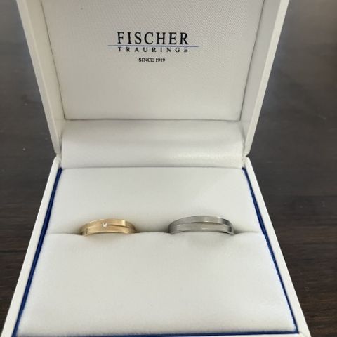 指輪のデザインは2ミリくらいの指輪を2つ組み合わせたとても変わったデザインでした。 女性はアプリコットゴールドで優しい色合いで金でギラギラもしてません! 日本ではあまり見ないようですが、フィッシャーブランド(ドイツ)ではプロモーションリングなんだとか! フィッシャーの中でも変わったデザインだと思います!
