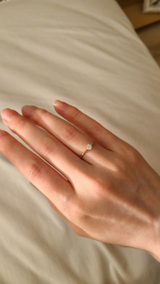 指輪を見に行く前は、ダイヤ無しのシンプルな物にしようと考えていました。 実際見てみると自分の好みはシンプルすぎず、派手すぎず上品なデザインの物が好みだと気づきました。 1つ石の指輪は様々なブランドでありますが、アノリューワンは他には無いデザインでとても気に入りました。 着け心地もよく、鍛造製法なのも安心です。