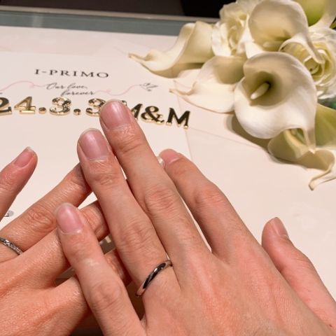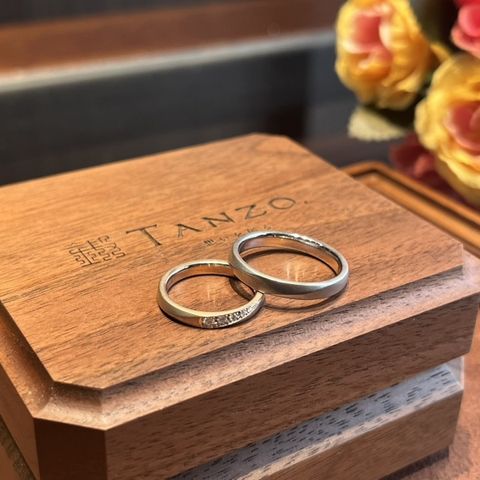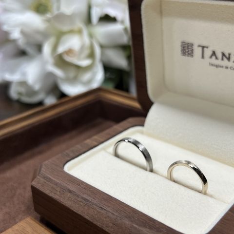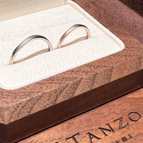 手作りならではのフィット感、丈夫な鍛造製法に惹かれて選びました!カラーや表面の加工など、ペア感を出しつつそれぞれが好きなデザインにしました! 肌なじみのいいカラーにして、何年でも着けられるデザインをしました!