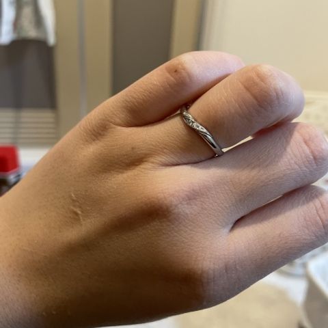 シンプルな形よりも、少し特徴のある形が好きなのでウェーブがかかっているデザインにしました。指が綺麗に細く見えます! 小さいダイヤも入っているので、キラキラしていて、つけているのを見ると結婚したんだなってうれしくなります。 婚約指輪は、同じブランドの違う種類の好きなデザインのものにしました。同じウェーブなので重ね付けにおすすめです!