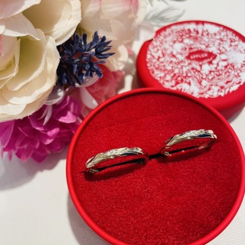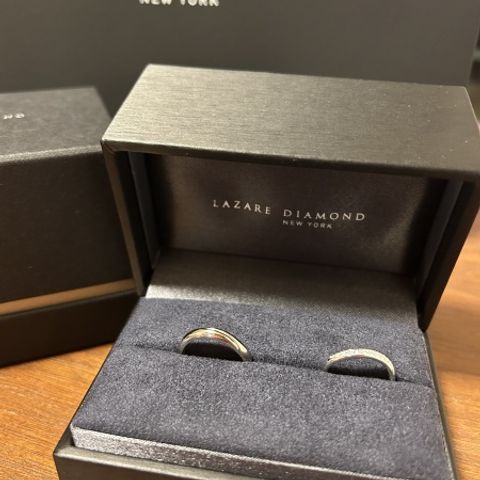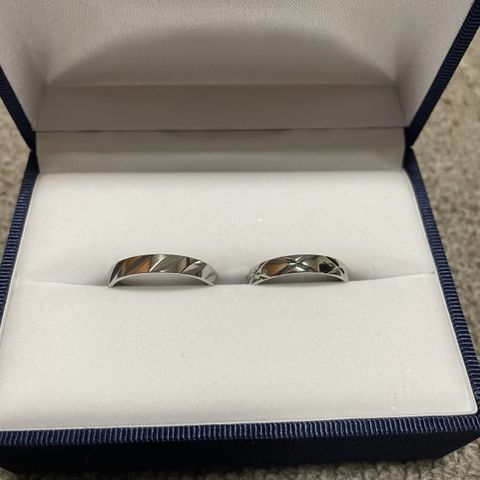 男性用: ストレート/平甲丸/3.5mm幅/鏡面仕上げ/表シンプル/手のひら側に動物のレーザー刻印 女性用: ストレート/平打ち/2.5mm幅/鏡面仕上げ/(ほんの少し)角丸加工/ダイヤ3石デザイン(それぞれ別のお部屋に埋込) 鍛造製法によって鍛えられたプラチナは、開けて瞬間見てすぐ分かる重厚感と輝きでした! 実際手に取ると見た目よりもずっしりしていて、頑丈さと質の高さを実感しました。 男性用は、手の甲側は鏡面仕上げデザインなしでとことんシンプルに地金の美しさ生かし、手のひら側にレーザー刻印を入れることで両面楽しめるのがポイントです。 女性用は、ダイヤが7色に輝いていて手元を見るたびにうっとりしてしまうくらい綺麗ですが、別のお部屋にしっかりと埋め込んであるので光りすぎず上品な輝きです。 スタイリッシュな印象にしたかったので平打ちを選びましたが、少し角が痛かったので、ほんの少し角丸加工を入れてもらうことで全く気にならなくなりました!