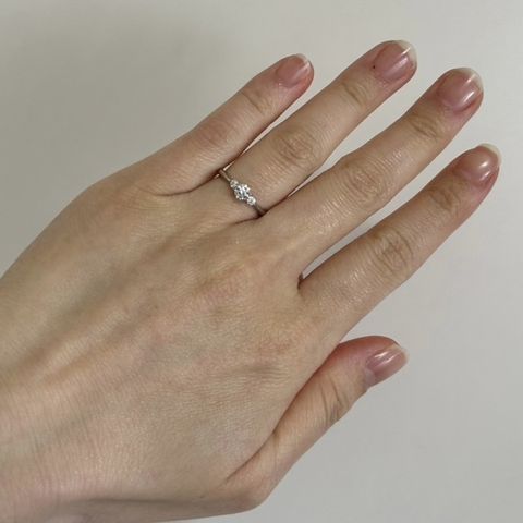 初めはシンプルなデザインを探しており、ダイモンド一石のみの指輪を購入しようとしていました。だけど実際に試着した時に、後々物足りなくなるような感じがし、今回のデザインに決めました。真ん中に大きなダイヤモンドが一石あり、非常に映えるデザインで気に入っています。