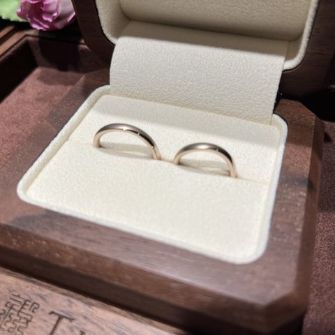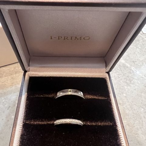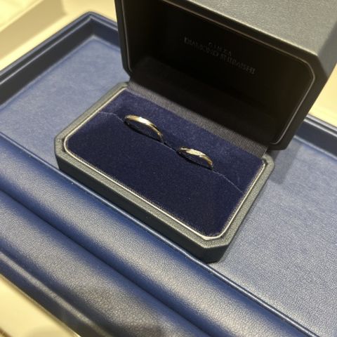 お互いのお揃い感を強く出したかったので、ダイヤが入っているのと同じ比率で旦那希望のアイスマット加工を入れ、おそろい感を強く出しました。指輪の色味は、色々あった中で自分たちの中で一番肌なじみのいいシャンパンゴールドを選びました。太さはそれぞれ自分の好みの太さにして、私が2.5ミリ幅、旦那が3ミリ幅にしました。