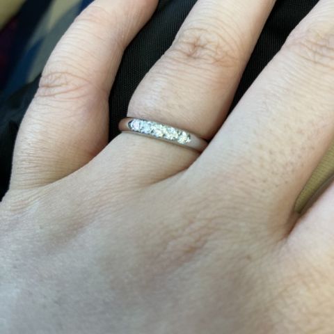 シルバーで細めのストレートで、ダイヤがななめに入った少しオシャレなデザイン。色白で長い指に合うようなデザインでおすすめしてもらった。ゴールドなども迷ったが、シルバーはどんなシーンでつけていても違和感なく派手すぎず、さりげないダイヤも良い。値段も高すぎず、コスパは悪くない。