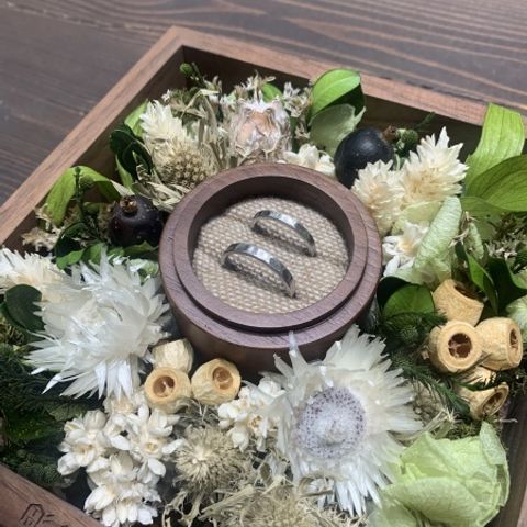 素材(価格はそれぞれです)は4種類から選べ、サンプルを見ながら、形や太さ、仕上げ加工も好きなものを選ぶことができます。どの組み合わせも素敵で、自分たちで時間をかけて手作りできるので特別感があります。指輪に付属の袋や購入できるケースも可愛いです。