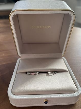 元々ウェーブのデザインが好きで、シンプルかつ仕事中でもつけれるデザインで一目惚れしました。 お店の人に聞いたところ、日本のブランドしかウエーブのデザインがないと聞き、驚きました! 指輪の裏には、刻印以外にもインフィニティダイア(一つのダイアを2人で分けて石をはめ込む世界で一つだけのダイア)やもう一つ誕生石など入れる事も可能で、自分たちの想いを込めれる指輪になりました。