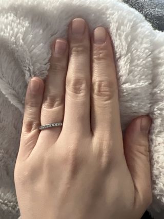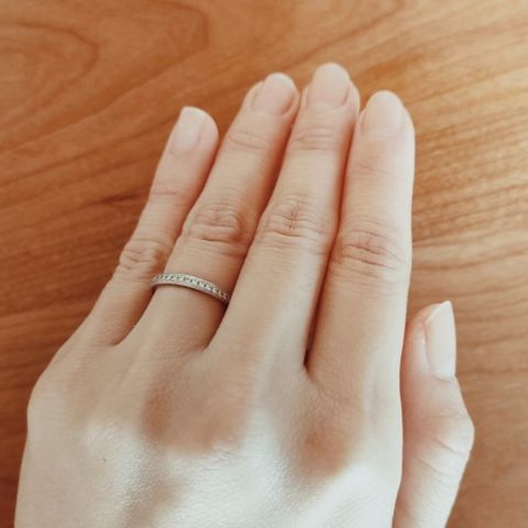 ハーフエタニティにミル打ちされたデザインがクラシックで素敵だと思い、購入を決めました。 また、自分は指が細くて短いので、存在感のある太めのデザインは似合わず、、かといって長く使うものなので、細すぎるデザインでは心配だなと思っていたので、この指輪のサイズ感がちょうどよく気に入りました。