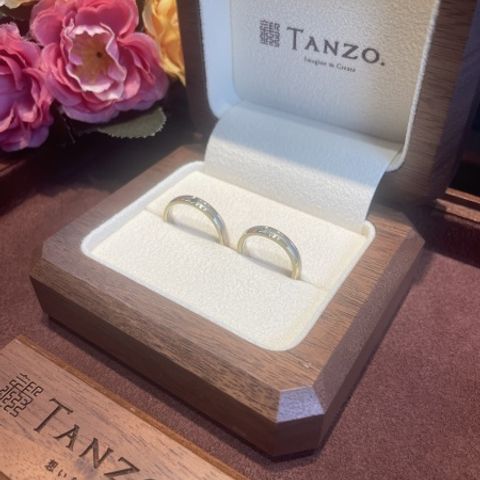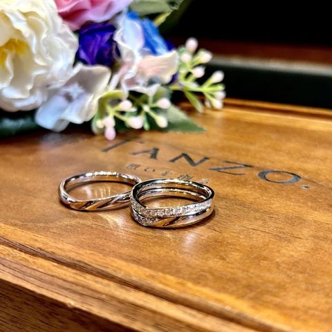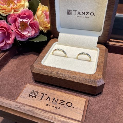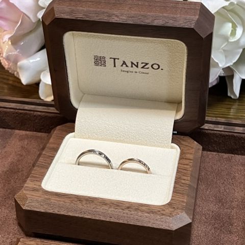 3色入っていて中心に大きなダイヤが入っているデザインがなく、こちらでフルオーダーしました。また、夫婦ともに仕事柄現場に出ることもあり強度の高いものがいいなと思うことや、仕事の時は別のペアリングを買おうかなど悩んでおりましたが、タンゾーでは鍛造製法で強度が高く、更に入籍指輪というサイズを確認できるペアリングを作成する事ができて、自分の要望を完璧に満たしたのでこちらで購入することを決めました。